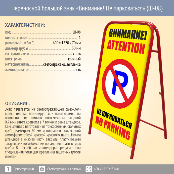 Переносной большой знак «Внимание! Не парковаться» (Ш-08, односторонний, светоотражающая пленка). Констукция знака в сложенном виде имеет размер 650 х 1220 х 70 мм. Размер печатной области - 1120 х 590 мм. Изображение печатается на светоотражающей самоклеящейся пленке, ламинируется и накатывается на основание (лист оцинкованного металла, толщиной 0,7 мм), затем крепится в 7 точках к раме штендера с одной стороны.