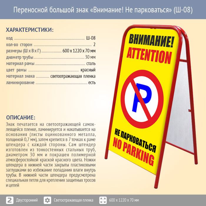Переносной большой знак «Внимание! Не парковаться» (Ш-08, двусторонний, светоотражающая пленка). Констукция знака в сложенном виде имеет размер 650 х 1220 х 70 мм. Размеры печатных областей - 1120 х 590 мм. Изображения печатаются на светоотражающей самоклеящейся пленке, ламинируются и накатываются на основания (листы оцинкованного металла, толщиной 0,7 мм), затем крепятся в 7 точках к раме штендера с двух сторон.