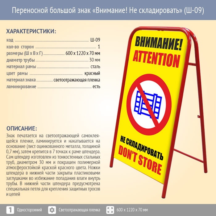 Переносной большой знак «Внимание! Не складировать» (Ш-09, односторонний, светоотражающая пленка). Констукция знака в сложенном виде имеет размер 650 х 1220 х 70 мм. Размер печатной области - 1120 х 590 мм. Изображение печатается на светоотражающей самоклеящейся пленке, ламинируется и накатывается на основание (лист оцинкованного металла, толщиной 0,7 мм), затем крепится в 7 точках к раме штендера с одной стороны.