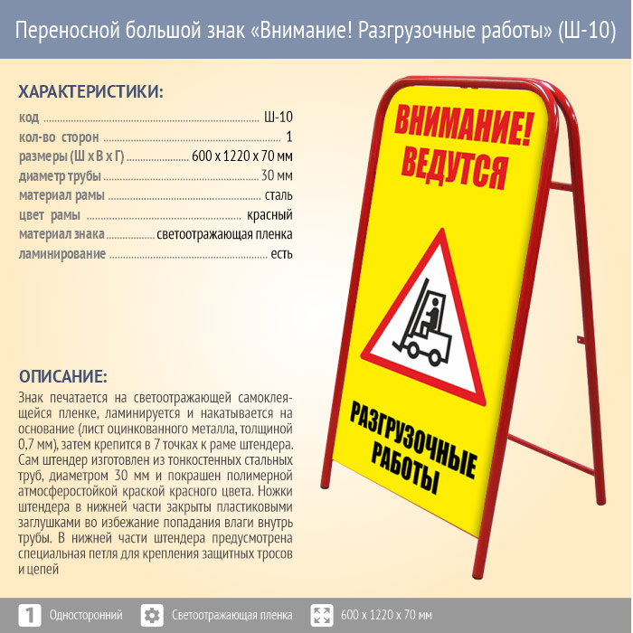 Переносной большой знак «Внимание! Разгрузочные работы» (Ш-10, односторонний, светоотражающая пленка). Констукция знака в сложенном виде имеет размер 650 х 1220 х 70 мм. Размер печатной области - 1120 х 590 мм. Изображение печатается на светоотражающей самоклеящейся пленке, ламинируется и накатывается на основание (лист оцинкованного металла, толщиной 0,7 мм), затем крепится в 7 точках к раме штендера с одной стороны.