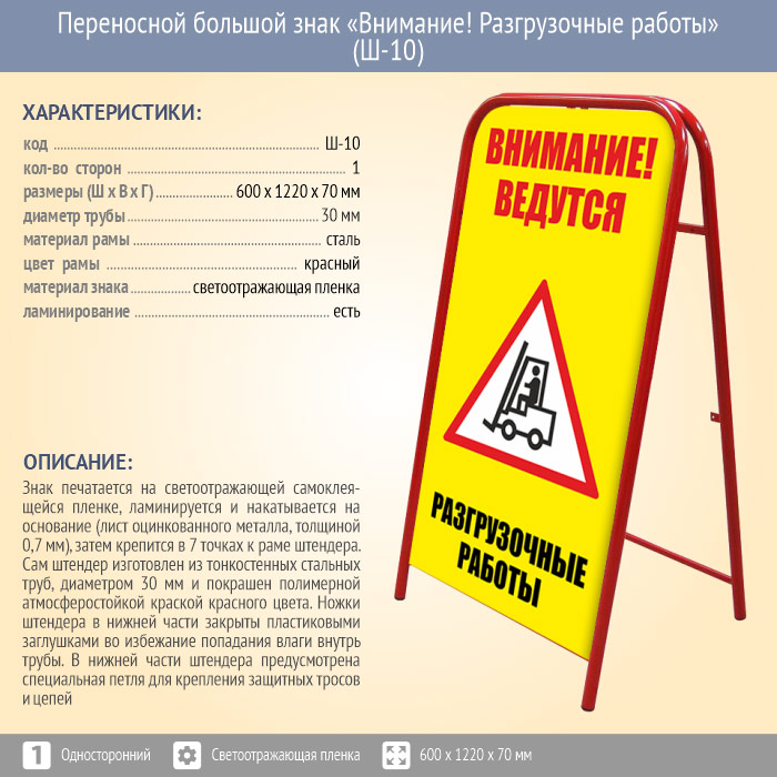 Переносной большой знак «Внимание! Разгрузочные работы» (Ш-10, двусторонний, светоотражающая пленка). Констукция знака в сложенном виде имеет размер 650 х 1220 х 70 мм. Размеры печатных областей - 1120 х 590 мм. Изображения печатаются на светоотражающей самоклеящейся пленке, ламинируются и накатываются на основания (листы оцинкованного металла, толщиной 0,7 мм), затем крепятся в 7 точках к раме штендера с двух сторон.