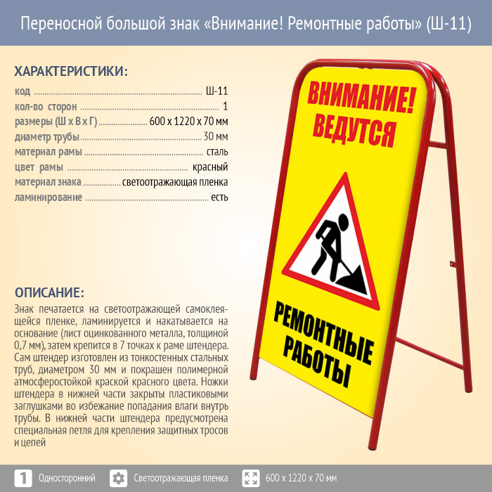 Переносной большой знак «Внимание! Ремонтные работы» (Ш-11, односторонний, светоотражающая пленка). Констукция знака в сложенном виде имеет размер 650 х 1220 х 70 мм. Размер печатной области - 1120 х 590 мм. Изображение печатается на светоотражающей самоклеящейся пленке, ламинируется и накатывается на основание (лист оцинкованного металла, толщиной 0,7 мм), затем крепится в 7 точках к раме штендера с одной стороны.