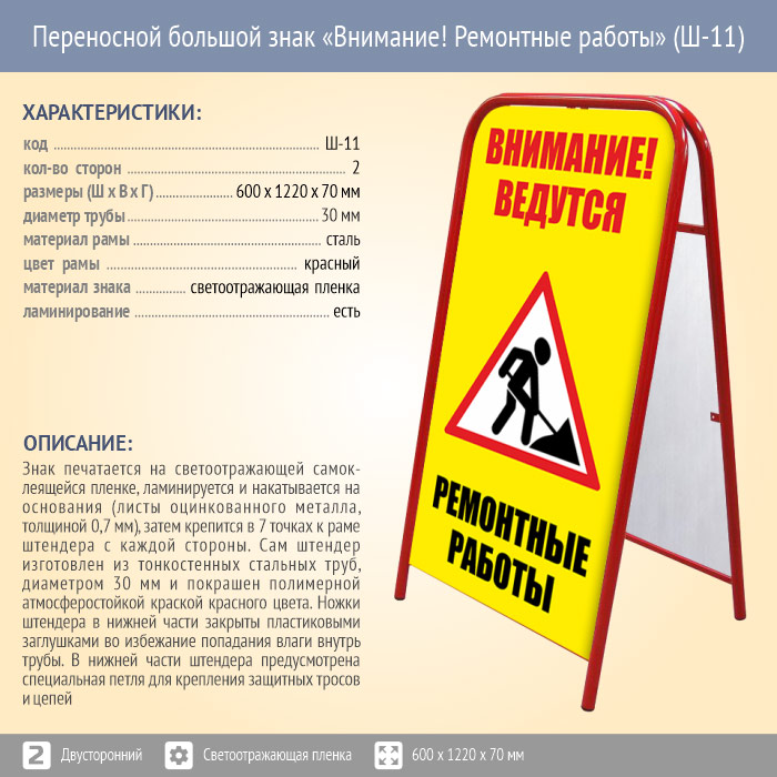 Переносной большой знак «Внимание! Ремонтные работы» (Ш-11, двусторонний, светоотражающая пленка). Констукция знака в сложенном виде имеет размер 650 х 1220 х 70 мм. Размеры печатных областей - 1120 х 590 мм. Изображения печатаются на светоотражающей самоклеящейся пленке, ламинируются и накатываются на основания (листы оцинкованного металла, толщиной 0,7 мм), затем крепятся в 7 точках к раме штендера с двух сторон.