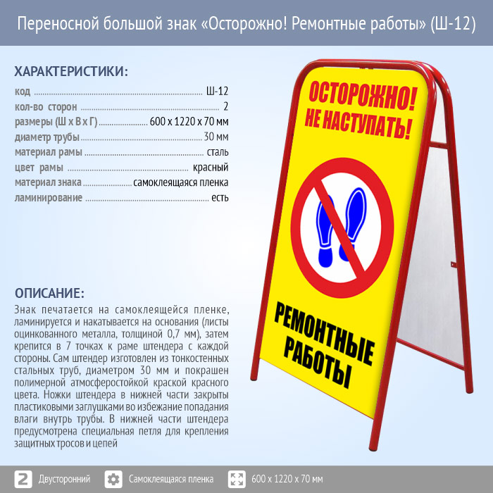 Переносной большой знак «Осторожно! Ремонтные работы» (Ш-12, двусторонний, самоклеящаяся пленка). Констукция знака в сложенном виде имеет размер 650 х 1220 х 70 мм. Размеры печатных областей - 1120 х 590 мм. Изображения печатаются на самоклеящейся пленке, ламинируются и накатываются на основания (листы оцинкованного металла, толщиной 0,7 мм), затем крепятся в 7 точках к раме штендера с двух сторон.