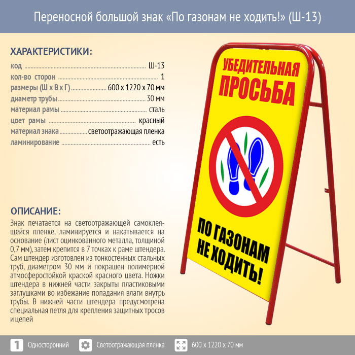 Переносной большой знак «По газонам не ходить!» (Ш-13, односторонний, светоотражающая пленка). Констукция знака в сложенном виде имеет размер 650 х 1220 х 70 мм. Размер печатной области - 1120 х 590 мм. Изображение печатается на светоотражающей самоклеящейся пленке, ламинируется и накатывается на основание (лист оцинкованного металла, толщиной 0,7 мм), затем крепится в 7 точках к раме штендера с одной стороны.