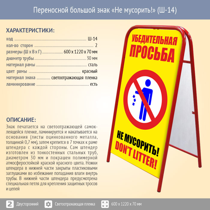 Переносной большой знак «Не мусорить!» (Ш-14, двусторонний, светоотражающая пленка). Констукция знака в сложенном виде имеет размер 650 х 1220 х 70 мм. Размеры печатных областей - 1120 х 590 мм. Изображения печатаются на светоотражающей самоклеящейся пленке, ламинируются и накатываются на основания (листы оцинкованного металла, толщиной 0,7 мм), затем крепятся в 7 точках к раме штендера с двух сторон.
