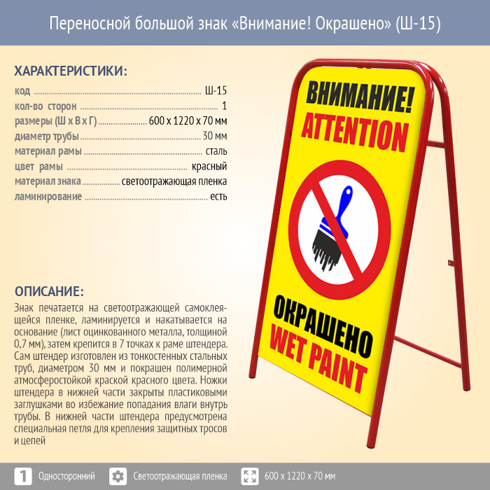 Переносной большой знак «Внимание! Окрашено» (Ш-15, односторонний, светоотражающая пленка). Констукция знака в сложенном виде имеет размер 650 х 1220 х 70 мм. Размер печатной области - 1120 х 590 мм. Изображение печатается на светоотражающей самоклеящейся пленке, ламинируется и накатывается на основание (лист оцинкованного металла, толщиной 0,7 мм), затем крепится в 7 точках к раме штендера с одной стороны.