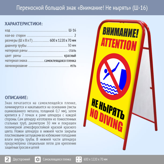 Переносной большой знак «Внимание! Не нырять» (Ш-16, двусторонний, самоклеящаяся пленка). Констукция знака в сложенном виде имеет размер 650 х 1220 х 70 мм. Размеры печатных областей - 1120 х 590 мм. Изображения печатаются на самоклеящейся пленке, ламинируются и накатываются на основания (листы оцинкованного металла, толщиной 0,7 мм), затем крепятся в 7 точках к раме штендера с двух сторон.
