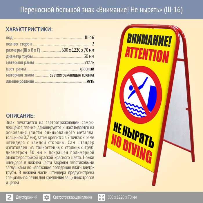 Переносной большой знак «Внимание! Не нырять» (Ш-16, двусторонний, светоотражающая пленка). Констукция знака в сложенном виде имеет размер 650 х 1220 х 70 мм. Размеры печатных областей - 1120 х 590 мм. Изображения печатаются на светоотражающей самоклеящейся пленке, ламинируются и накатываются на основания (листы оцинкованного металла, толщиной 0,7 мм), затем крепятся в 7 точках к раме штендера с двух сторон.