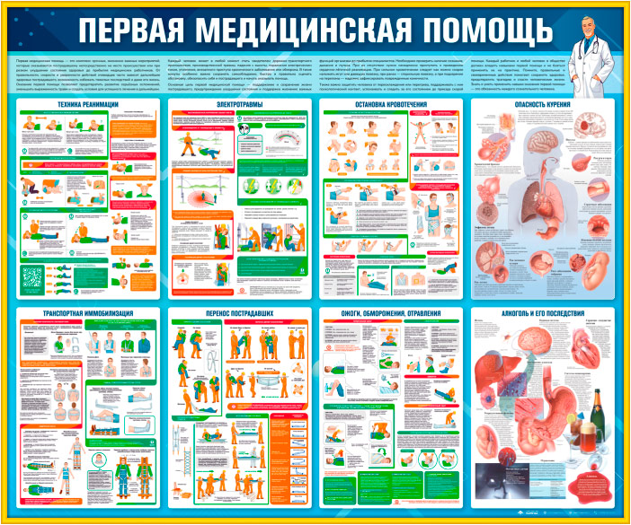 Стенды по первой доврачебной помощи содержат информацию по оказанию первой помощи до прибытия бригады врачей скорой помощи