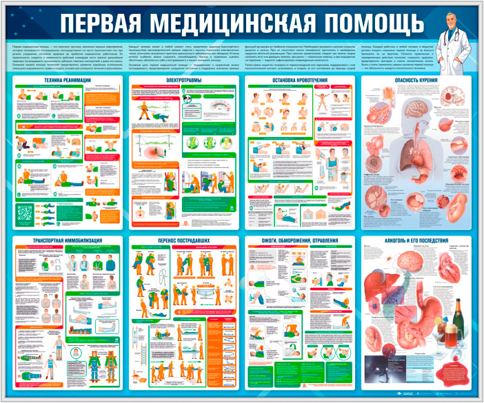 Стенды по первой доврачебной помощи содержат информацию по оказанию первой помощи до прибытия бригады врачей скорой помощи