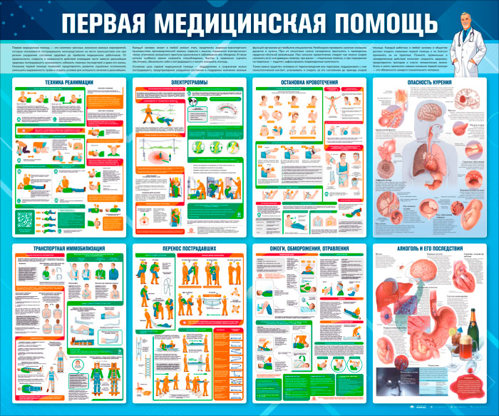 Стенды по первой доврачебной помощи содержат информацию по оказанию первой помощи до прибытия бригады врачей скорой помощи
