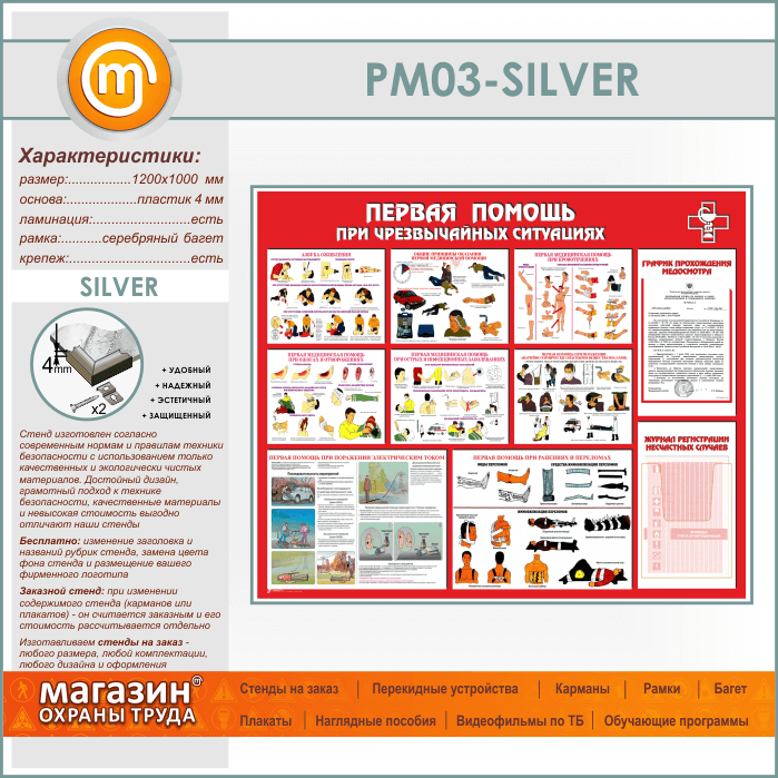 Стенд «Первая помощь при чрезвычайных ситуациях» с плоским и объемным карманами (PM-03-SILVER)