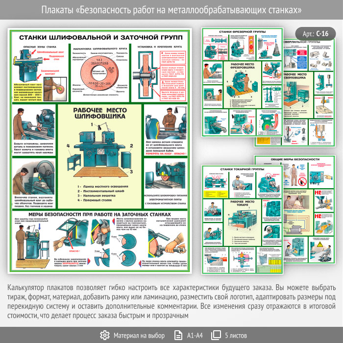 Плакат «Безопасность работ на металлообрабатывающих станках» (С-16, 5 листов)