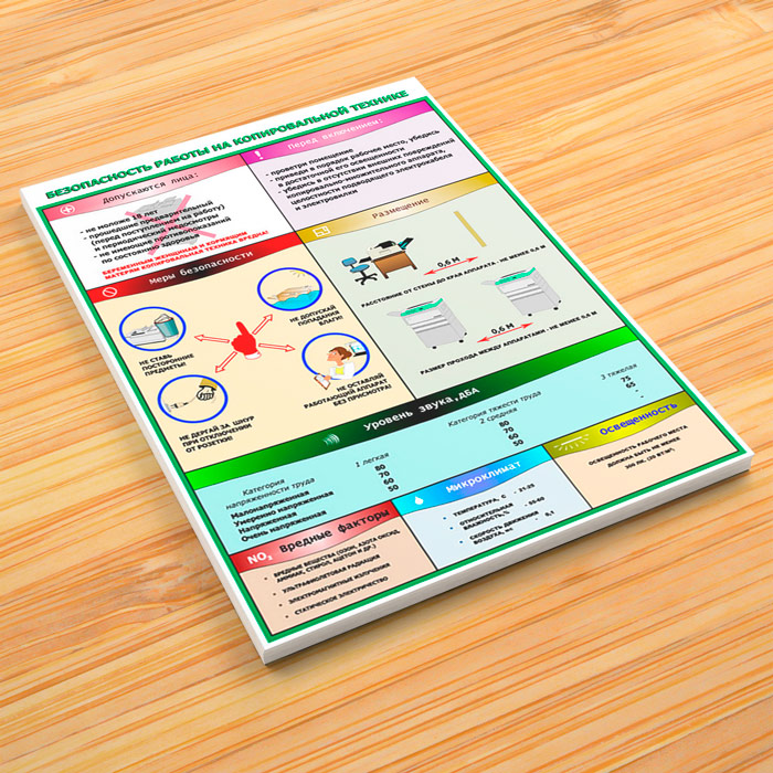Плакат «Безопасность работы на копировальной технике» – необходимое напоминание о важности организации безопасной работы в офисе. Плакат посвящен требованиям безопасности при работе на копировальных аппаратах – размещение и меры безопасности, вредные факторы, микроклимат и освещенность