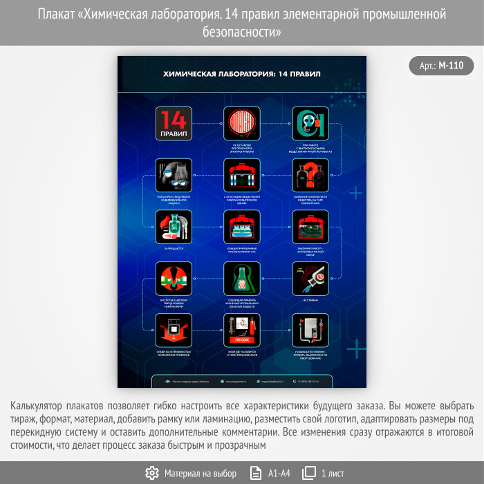 Плакат «Химическая лаборатория. 14 правил элементарной промышленной безопасности» может быть изготовлен любого формата и размера, на бумаге, самоклеящейся пленке, пластике, баннерной ткани и металле. Разрабатываем, рисуем и изготавливаем плакаты на любую интересующую Вас тематику