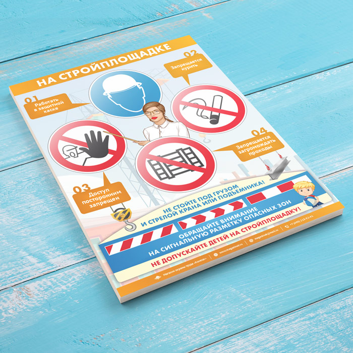 Плакат «На стройплощадке» содержит блок знаков, отражающих основные правила поведения на стройплощадке