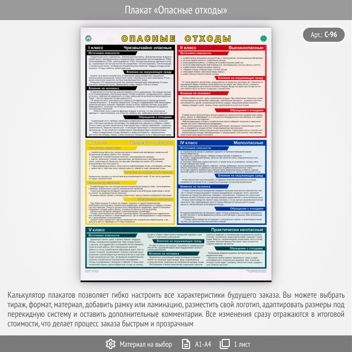 Плакат «Опасные отходы» содержит классификацию отходов по степени воздействия на окружающую среду и человека. Рассказывает об источниках, содержащих опасные отходы и обращении с ними