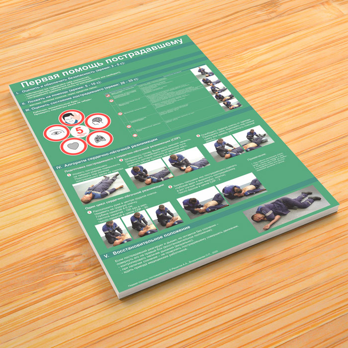 Плакат «Первая помощь пострадавшему» составлен на основе последних инструкций Минздрава, тогда как в интернете вы найдете только старые плакаты с недействующими требованиями. В плакате расписаны 5 шагов, из которых должна состоять первая помощь до приезда бригады скорой помощи