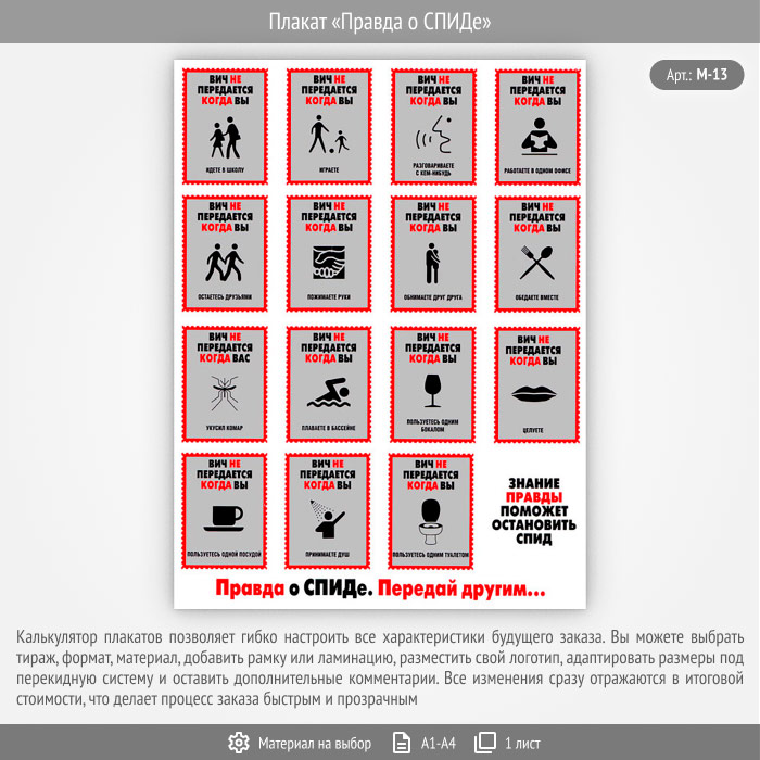 Плакат «Правда о СПИДе» может быть изготовлен любого формата и размера, на бумаге, самоклеящейся пленке, пластике, баннерной ткани и металле. Разрабатываем, рисуем и изготавливаем плакаты на любую интересующую Вас тематику