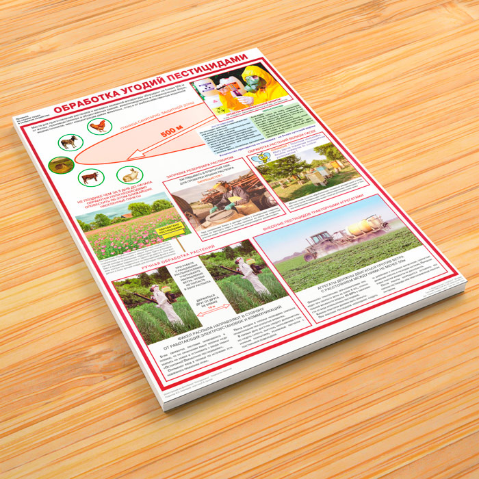Плакат «Правила по охране труда в сельском хозяйстве. Обработка угодий пестицидами» содержит информацию о ручной обработке растений, внесении пестицидов тракторными агрегатами, обработке растений вблизи пасек, заправке резервуара раствором