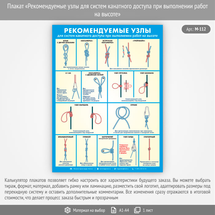 Плакат «Рекомендуемые узлы для систем канатного доступа при выполнении работ на высоте» (М-112, 1 лист)