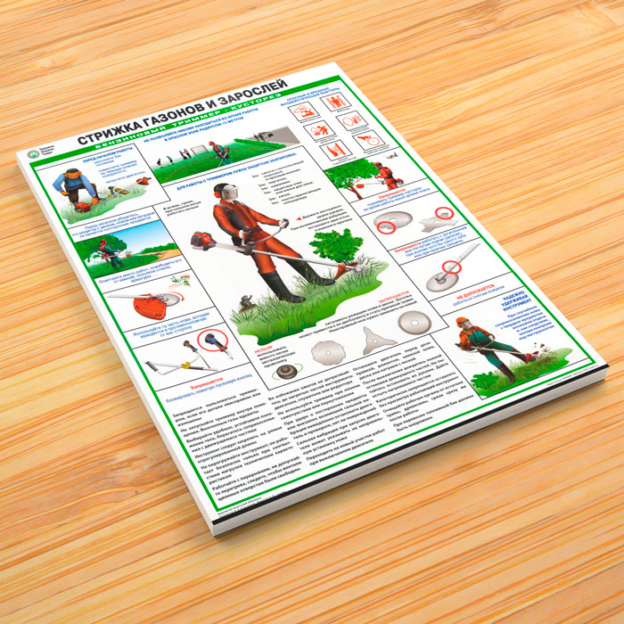 Плакат «Стрижка газонов и зарослей. Бензиновый триммер-кусторез» содержит информацию о технике безопасности при работе с бензиновым триммером, об опасных и вредных факторах, о защитной экипировке и прочих нюансах такой работы