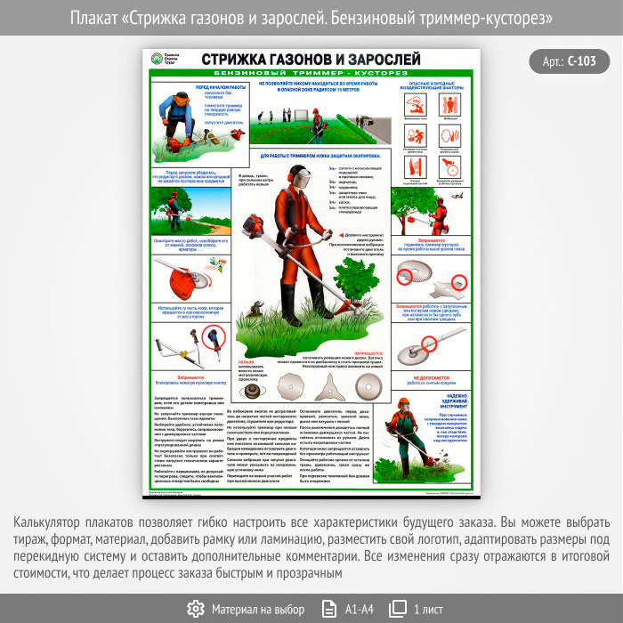 Плакат «Стрижка газонов и зарослей. Бензиновый триммер-кусторез» (С-103, 1 лист)