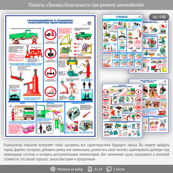 Комплект плакатов «Безопасность труда при ремонте автомобилей» из 5 листов – достойное качество и полезная информация по приемлемой цене
