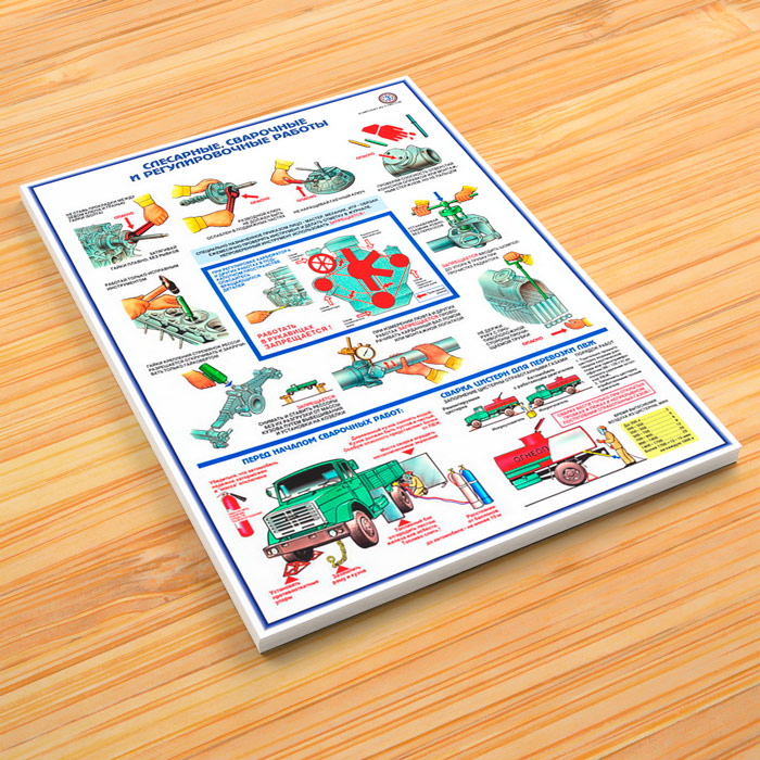 - Плакат «Слесарные сварочные и регулировочные работы» – техника безопасности, подготовка к сварочным работам и сварка цистерн для перевозки ЛВЖ