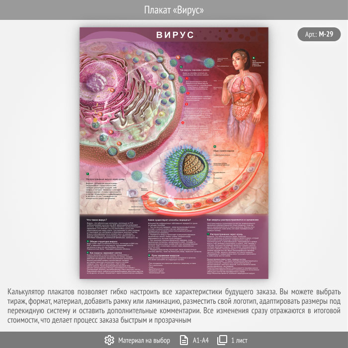 Плакат «Вирус» рассказывает о том, что такое вирус и какие органы он может поражать, о путях заражения и способах его передачи, об общей структуре вирусов и том, как они заражают клетки и распространяются в организме. Плакат имеет качественный дизайн и художественные иллюстрации