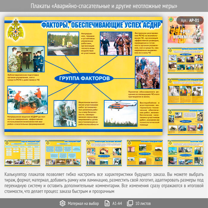 Комплект плакатов «Аварийно-спасательные и другие неотложные меры» из 10 листов может быть изготовлен любого формата и размера, на бумаге, самоклеящейся пленке, пластике, баннерной ткани и металле. Разрабатываем, рисуем и изготавливаем плакаты на любую интересующую Вас тематику