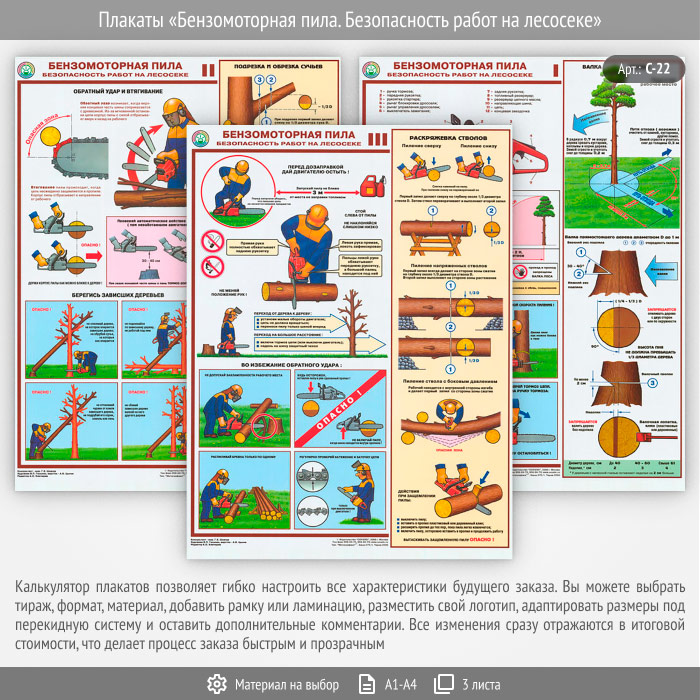 Плакаты «Бензомоторная пила. Безопасность работ на лесосеке» (С-22, 3 листа)