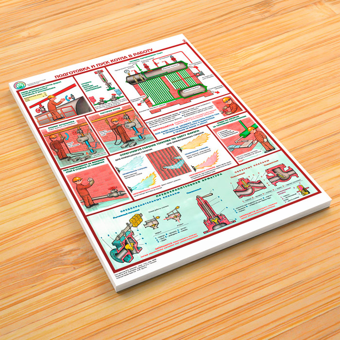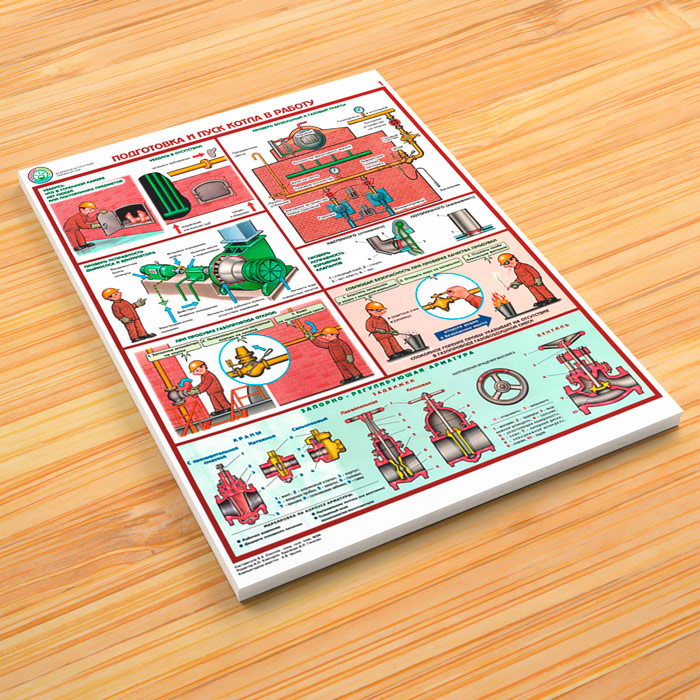 - Два плаката «Подготовка и пуск котла в работу» – проверка исправности, продувка, проверка тракта, розжиг запальника, растопка котла, регулировка горения, запорно-регулирующая и предохранительная аппаратура