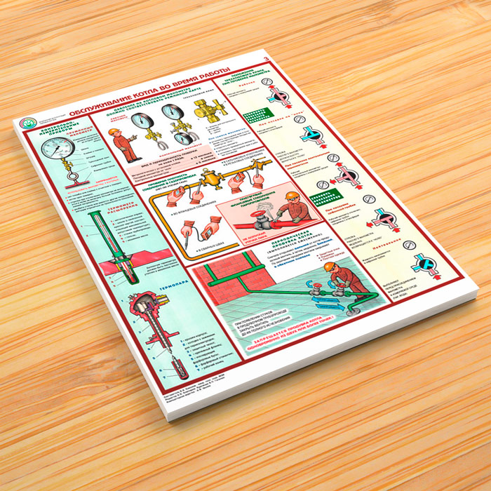 - Два плаката «Обслуживание котла во время работы» – контрольно-измерительные приборы, положения трехходового крана при проверке манометра, проверка исправности и продувка котла