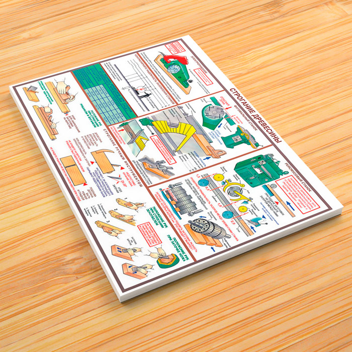- Плакат «Строгание древесины» – безопасность работ с электрорубанком, фуговальном станке, рейсмусовом станке, строгание ручным инструментом