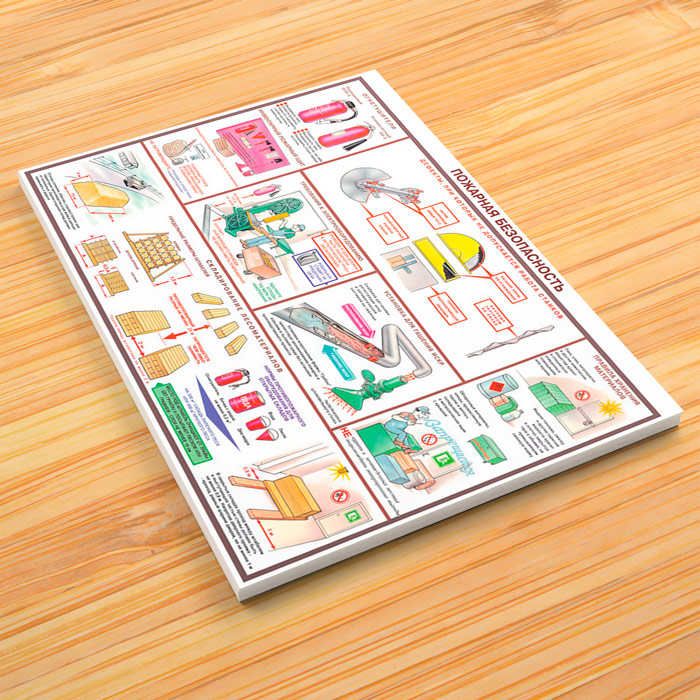 - Плакат «Пожарная безопасность» – дефекты станков, использование огнетушителей, правила хранения материалов, требования к оборудованию, складирование лесоматериалов