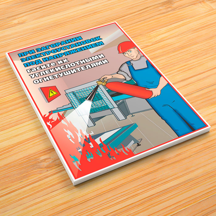 - Плакат «При загорании электроустановок под напряжением гасите их углекислотными огнетушителями»