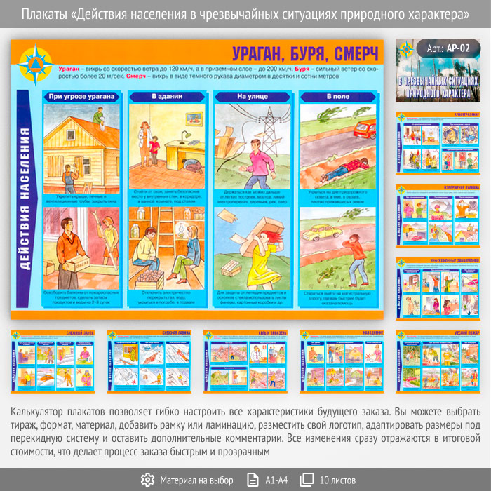 Комплект плакатов «Действия населения в чрезвычайных ситуациях природного характера» из 10 листов может быть изготовлен любого формата и размера, на бумаге, самоклеящейся пленке, пластике, баннерной ткани и металле. Разрабатываем, рисуем и изготавливаем плакаты на любую интересующую Вас тематику