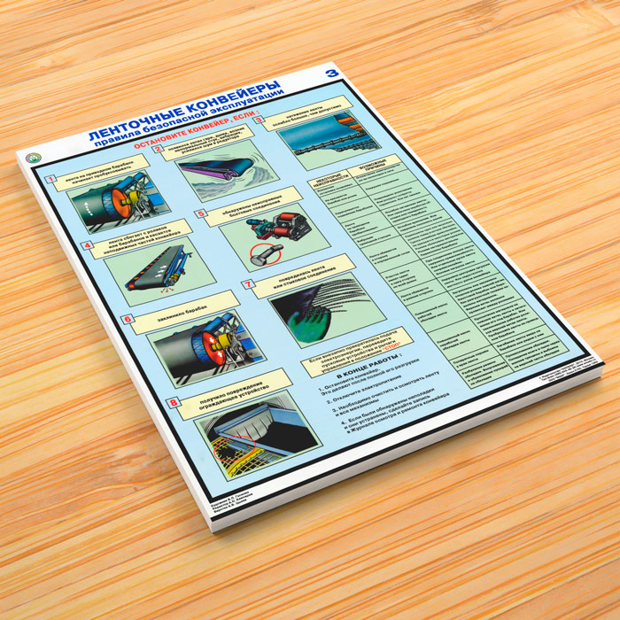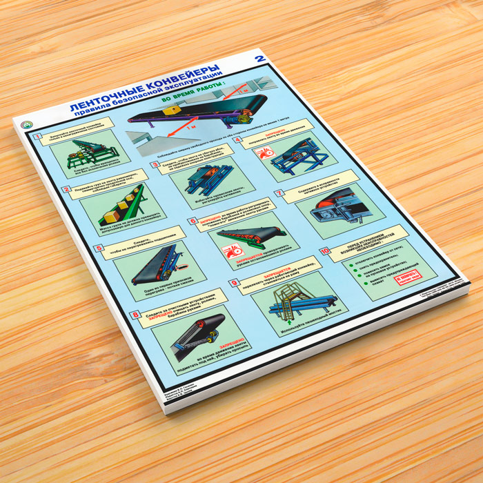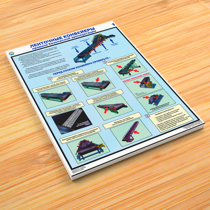 Комплект плакатов «Ленточные конвейеры. Правила безопасной эксплуатации» из 3 листов содержит информацию об устройстве и правилах безопасной эксплуатации ленточных конвейеров, а также о неисправностях конвейеров и возможных причин их возникновения
