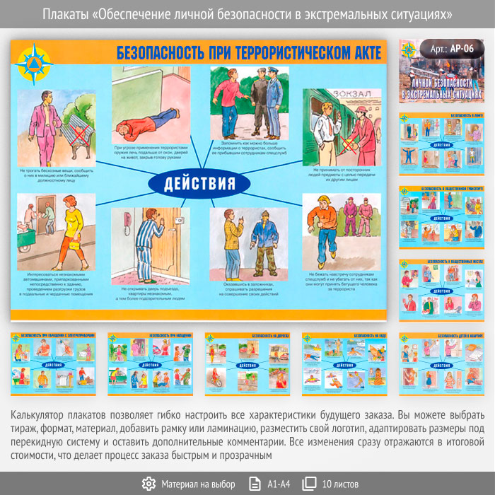 Комплект плакатов «Обеспечение личной безопасности в экстремальных ситуациях» из 10 листов может быть изготовлен любого формата и размера, на бумаге, самоклеящейся пленке, пластике, баннерной ткани и металле. Разрабатываем, рисуем и изготавливаем плакаты на любую интересующую Вас тематику