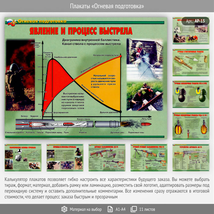 Комплект плакатов «Огневая подготовка» может быть изготовлен любого формата и размера, на бумаге, самоклеящейся пленке, пластике, баннерной ткани и металле. Разрабатываем, рисуем и изготавливаем плакаты на любую интересующую Вас тематику