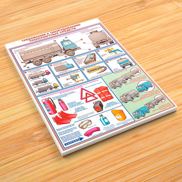 - Плакат «Требования к оборудованию транспортных средств» – ТС для перевозки взрывчатых и легковоспламеняющих веществ, оборудование и дополнительное оборудование, правила перевозки