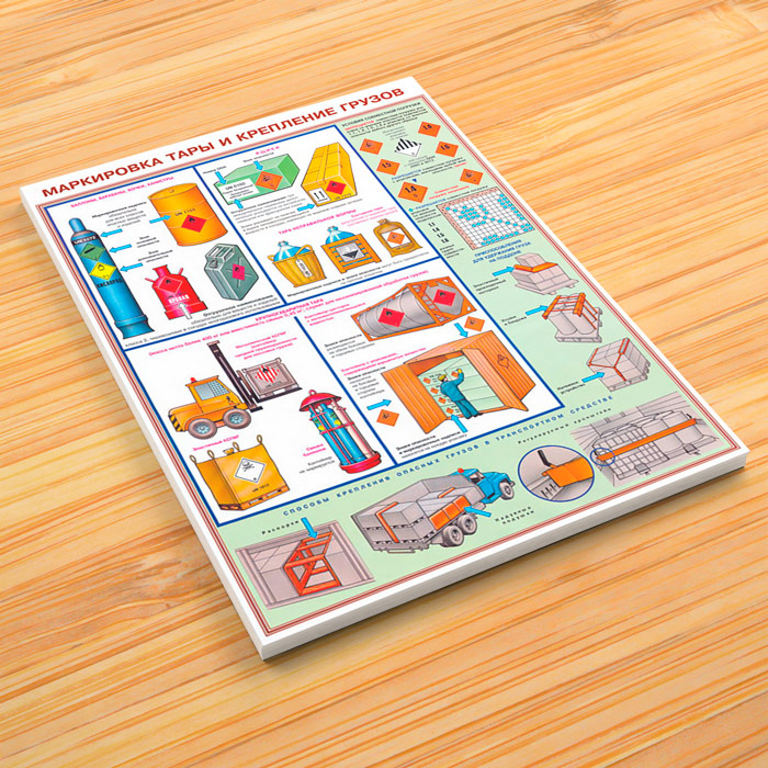 - Плакат «Маркировка тары и крепление грузов» – маркировка баллонов, ящиков, крупногабаритной тары, условия совместной перевозки и способы крепления