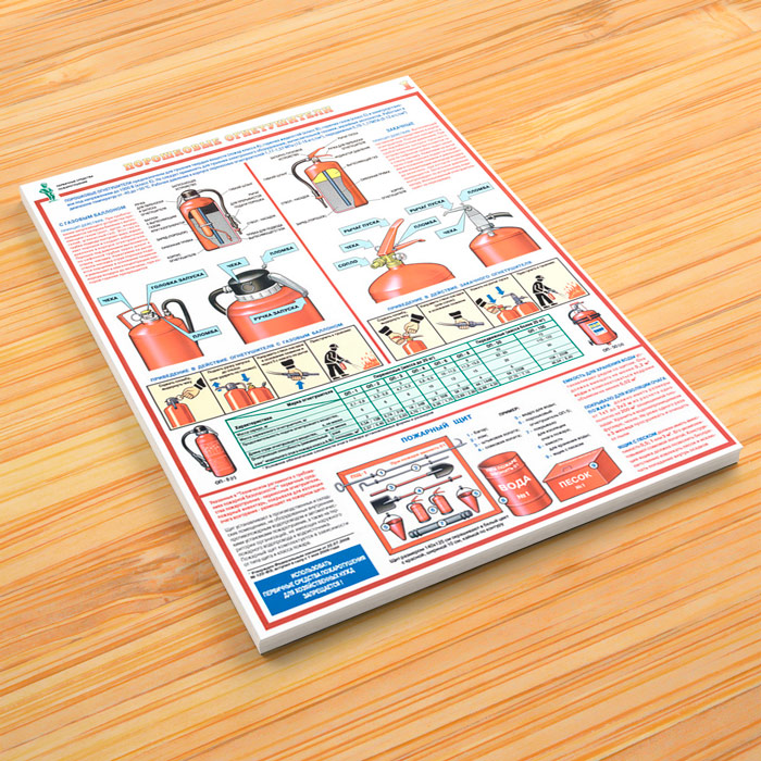 - Плакат «Порошковые огнетушители» – устройство, хранение и использование, пожарный щит