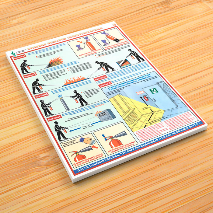 - Плакат «Тушение пожаров огнетушителями» – классы пожаров A, B, C, D, E, F, размещение огнетушителей в общественных зданиях и сооружениях