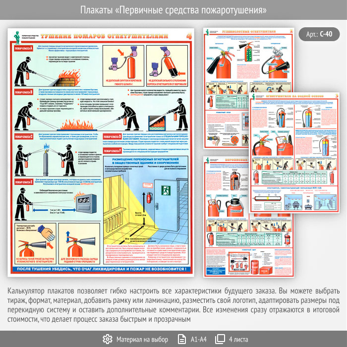Плакаты «Первичные средства пожаротушения» (С-40, 4 листа)