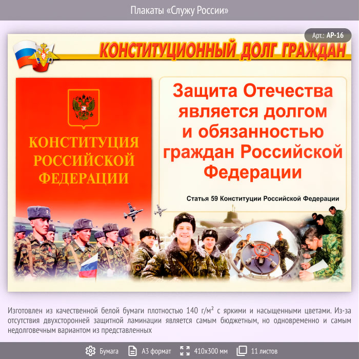 Комплект плакатов «Служу России» изготавливается в А3 формате (точный размер – 410х300 мм)