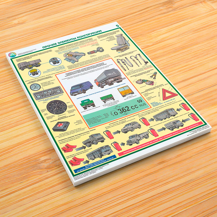 - Два плаката – «Прочие элементы конструкции» – зеркала, уплотнители, замки, стекла, подвеска, брызговики, сцепные устройства, ремни безопасности, звуковой сигнал, приборная панель…