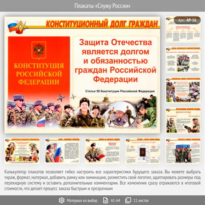 Комплект плакатов «Служу России» может быть изготовлен любого формата и размера, на бумаге, самоклеящейся пленке, пластике, баннерной ткани и металле. Разрабатываем, рисуем и изготавливаем плакаты на любую интересующую Вас тематику
